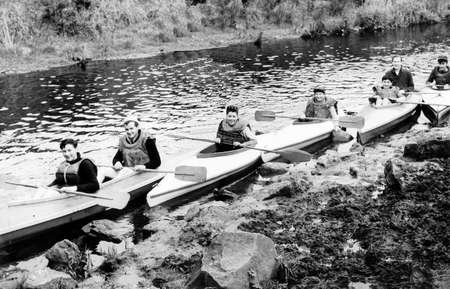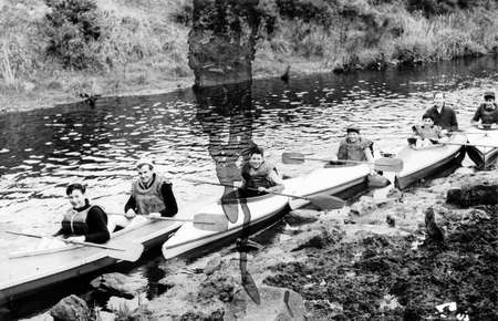 Left to right in this line-astern formation are John Fitzpatrick (14) of Denbeath with P.T. Teacher Mr Ian Scott; James Davidson (12), Buckhaven; Robert Wardlaw (13) Methil; Sam Blues (14) Buckhaven with Mr Simon Alford, English Teacher; and finally Peter Kirkaldy (14), Denbeath. The picture above shows pupils and staff trying out their craft on the River Leven on a Saturday morning.